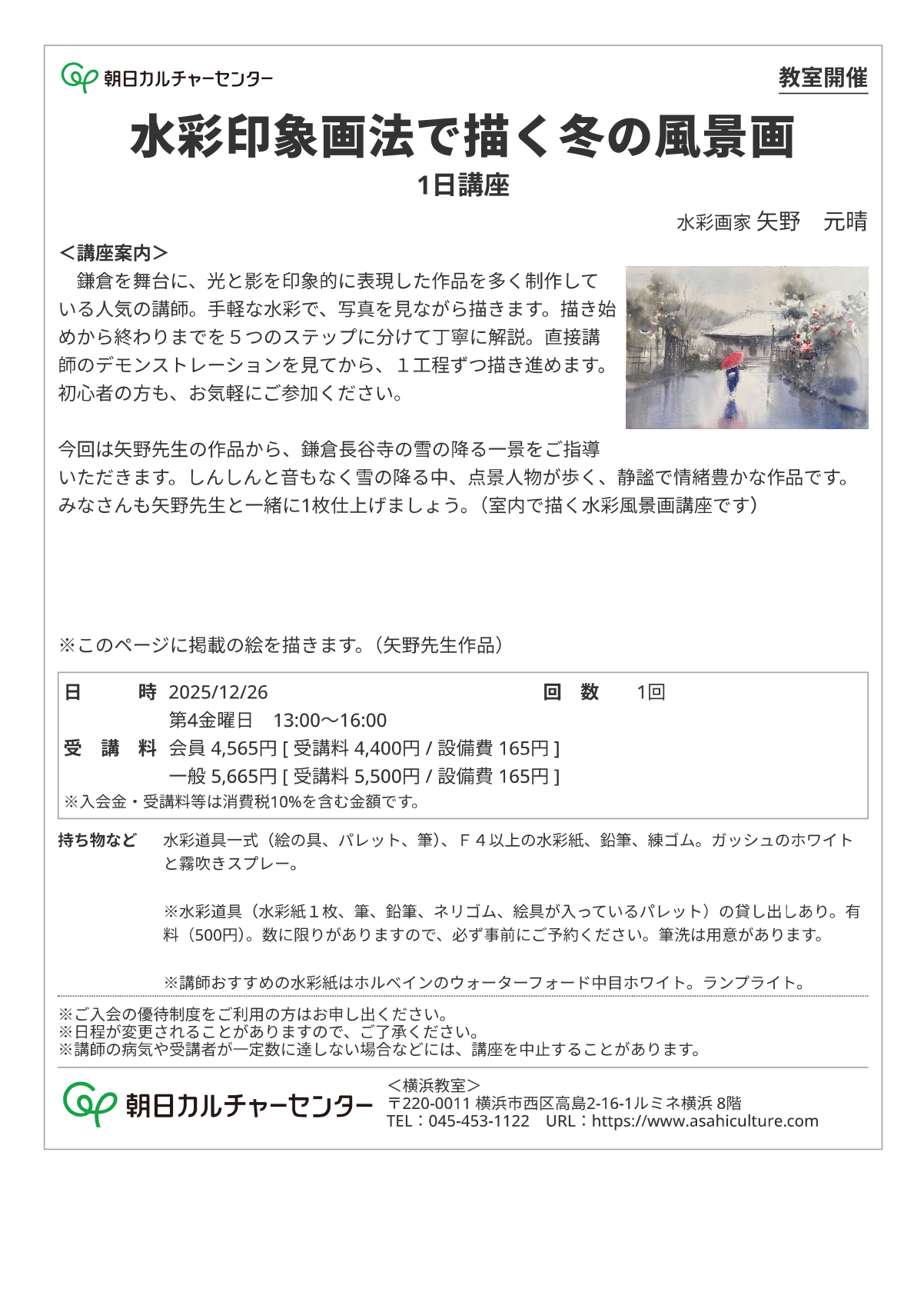 2025.09.17 ワークショップ・講座 【冬季講座も受付開始】横浜・朝日カルチャーセンターにて講座開催いたしました!! まだまだ日中は暑さが全開の9月を迎えておりますが皆様いかがお過ごしでしょうか。涼しい秋は目前(のはず!)もう一踏ん張りして乗り越えていきましょう^^ 本日の題材はこちら! スケッチ。 ファーストウォッシュ。 セカンドウォッシュ。 バルールを整えて・・・ ディティールを描き込んで完成! 講評の時間。 とても楽しそうな夏の一場面が描けておりました。ご参加の皆様お疲れ様でした^^ありがとうございました! 最後にお知らせとなりますが、12/26冬の講座を開催させていただくことが決まりました^^鎌倉の雪景色を描きます。ご興味のある方は奮ってご参加くださいませ! 申し込み詳細はこちらから