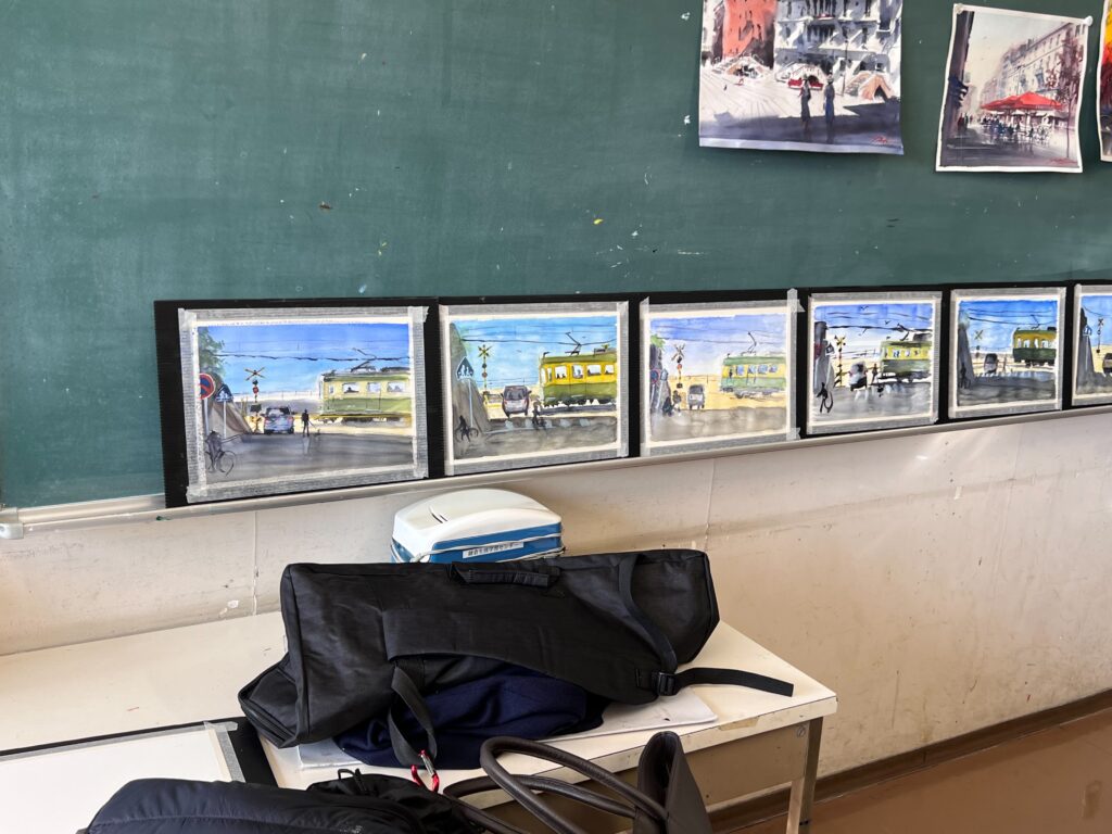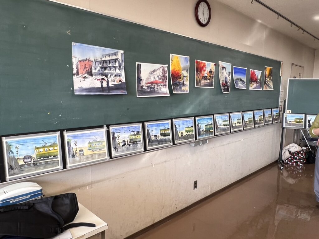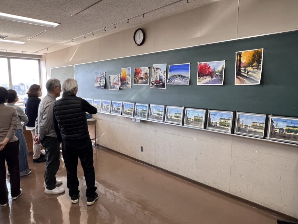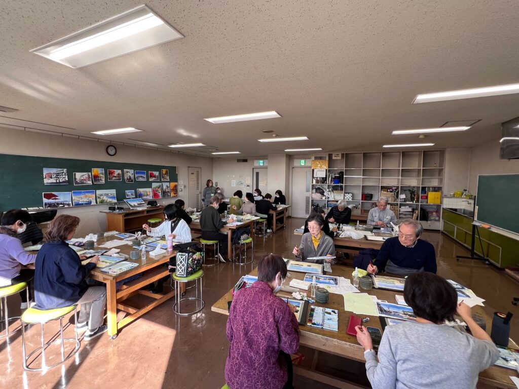 2025.11.28 ワークショップ・講座 【鎌倉生涯学習センター・きらら鎌倉にて】水彩画ワークショップを開催しました! 本日はきらら鎌倉にて水彩画ワークショップの講師をさせていただきました!『江ノ電』をモチーフとした風景をデモンストレーションしながら、印象的にムードを重視して描いていくルースペインティングというスタイルを学んでいただきました。講座の時間内で全員が作品を描き上げることができました^^ 完成作品はこちら! 講評の時間。和気藹々と^^ もっと学んでみたいというお声も! ご参加いただいた皆様ありがとうございました!