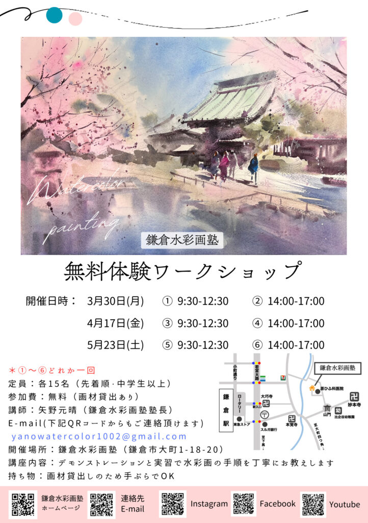 2026.03.12 ワークショップ・講座 【’26 3月4月5月】”無料体験ワークショップ”のお知らせ!! 無料体験ワークショップのお知らせです! 3月30日(月)午前&午後 4月17日(金)午前&午後 5月23日(土)午前&午後 画材も貸し出しいたしますので、お気軽にお問い合わせください^^ お問い合わせフォームはこちら 先着順ですのでご希望の方はお早めにどうぞ!